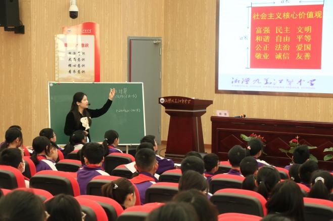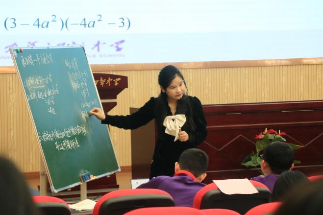 熊姝老师以“打印‘社会主义核心价值观’牌匾”这一件贴近生活的事例引入平方差公式,通过计算观察规律得出猜想并证明,再从代数到几何的角度带领同学们对平方差公式进行深度探讨。以轻快的语言让小朋友们都积极思考、回答问题。在例题讲解中,熊姝老师用4个变式来加深同学们对平方差公式在计算中的灵活应用和理解。