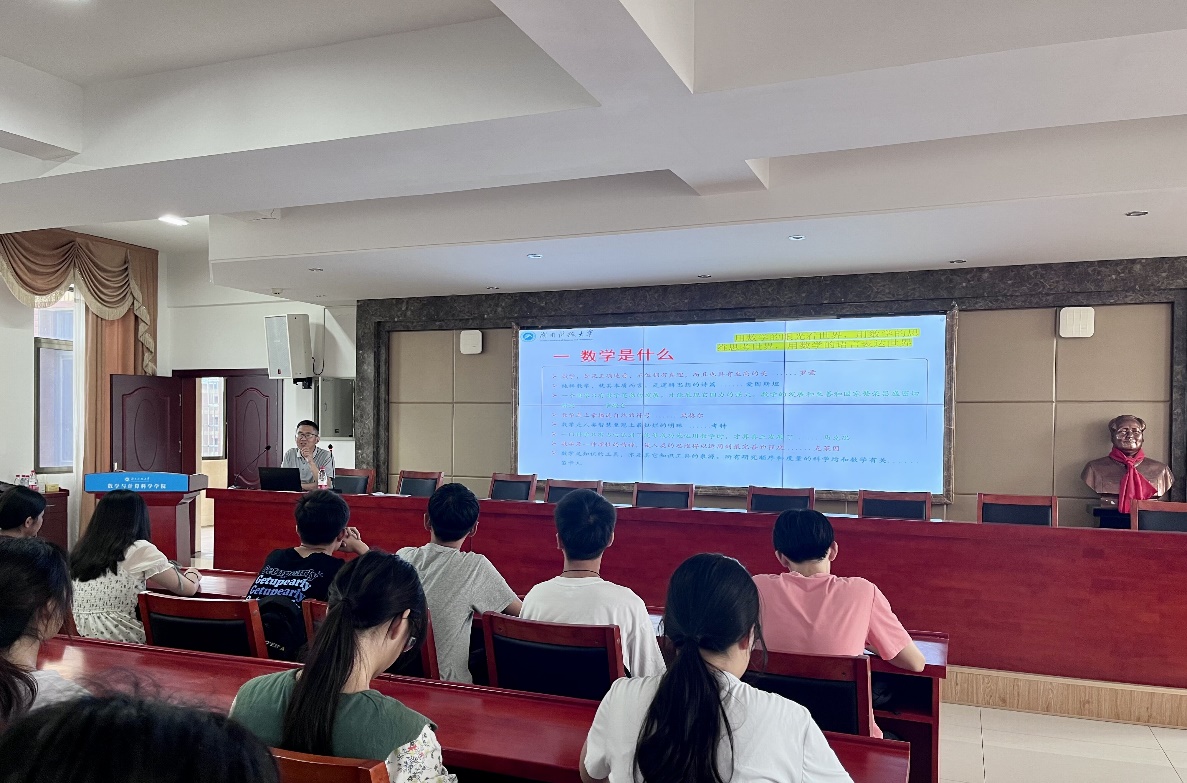 借助上面的评价,王卫兵副教授引出了这次讲座所要阐释的首要问题即“数学是什么?”他介绍:数学是一种理性的精神,数学是一种文化,是现代文明的重要组成部分。数学的定义大多是宽泛的,但其内涵和本质蕴含于每个研究数学、探寻数学的人心中,如熠熠星光驱散未知的迷雾与黑暗。