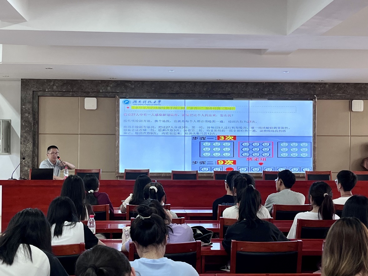 接着,王卫兵副教授为大家展现了“有用的数学”。著名物理学家牛顿首先用数学方法提出了万有引力的计算公式;爱因斯坦相对论的质能公式从数学论证的角度预示了原子能时代的来临;电子数字计算机的诞生和发展在数学理论的指导下进行;国家所采用的核酸检测手段“混检”也是靠数学计算所选择出的最能节省成本的方式。凡此种种,数学的巨大作用早已辐射在我生活的方方面面。马克思曾说过:“一门科学,只有当它成功地运用数学时,才能到达真正完善的地步”。可见,数学对其他学科的发展也产生了深刻的影响。