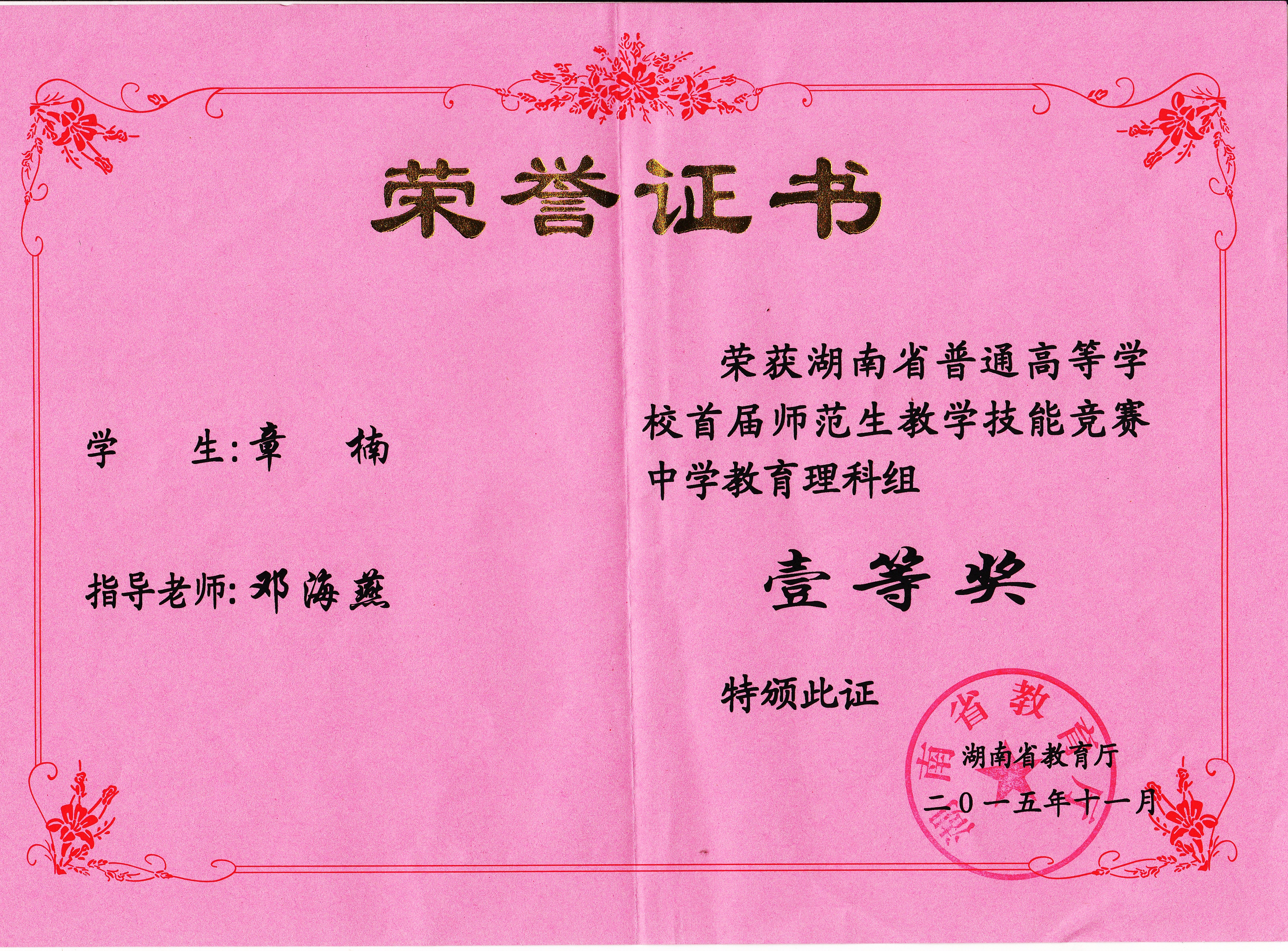2015年湖南省首届师范生教学技能竞赛获奖名单