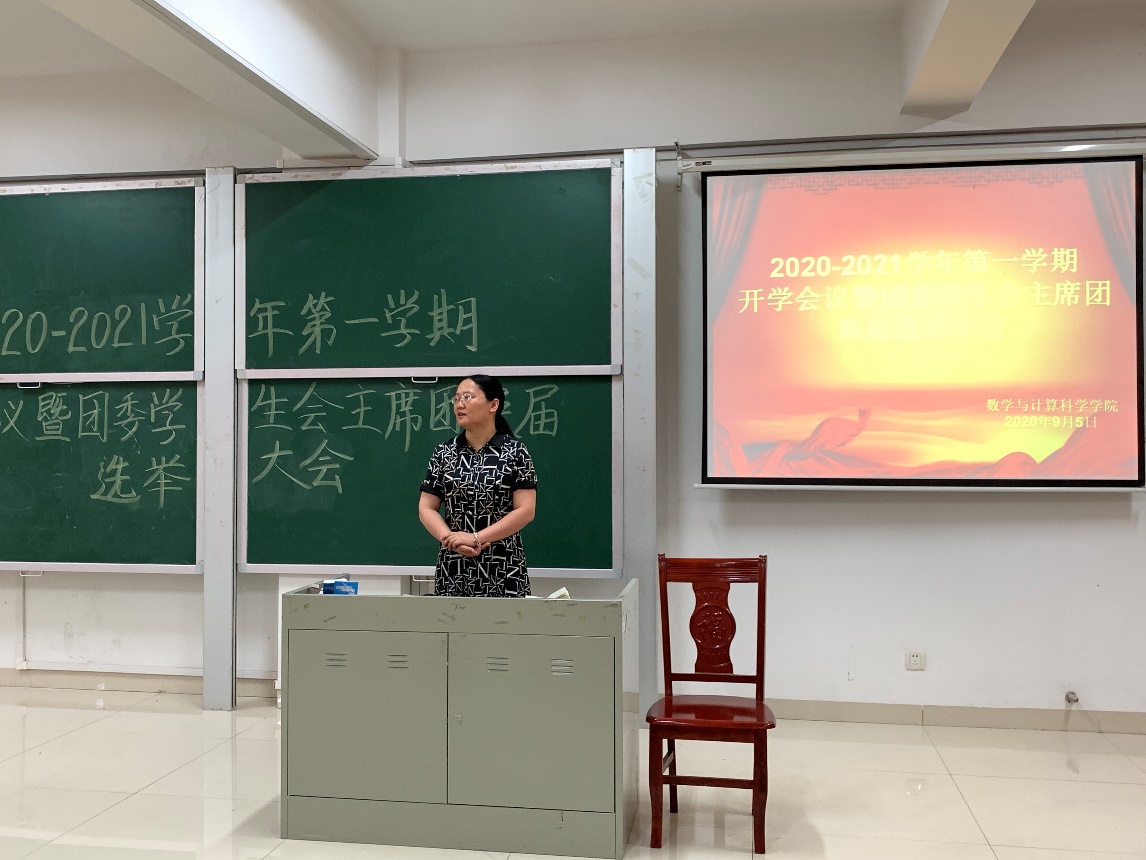 新学期新气候,学校工作也迎来了新的安排。数学与计算科学学院于9月5日在立志楼A101召开了新学期开学会议暨团委员工会主席团换届选举会。出席本次会议的有学院副书记刘学泳,17级辅导员袁晓,18级辅导员关剑成,19级辅导员李大静,20级辅导员吴雅婷,院员工会主席陈佳琦同学,院团委第一副书记李经纬同学及全体团委员工会干部。