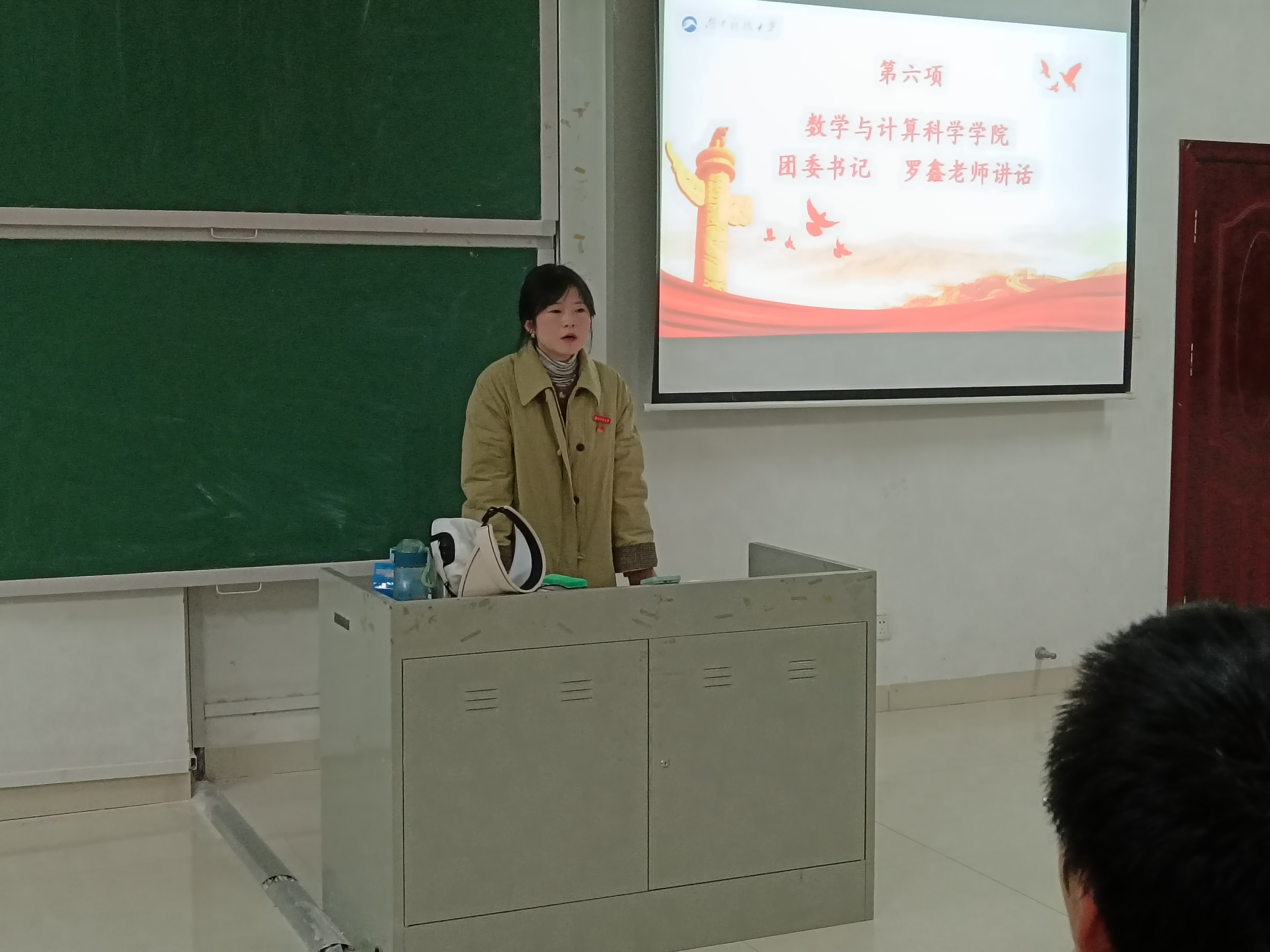 接下来,数学与计算科学学院团委书记罗鑫老师进行讲话,对在座团员寄予希望,殷切期盼各位团员 无论是在生活上还是学习上不断反思与前进,并主动承担责任。罗鑫老师表示“承担责任能获得自尊和自信,增长才干,获得承认和赞誉。”