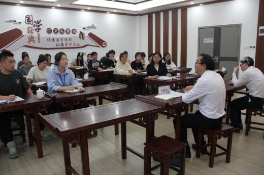 在九华江声中学崇德楼二楼国学馆,九华江声中学董事长刘辉董事长和学院的数院领导就实习生的学习工作和未来数学教育方向展开了深入交流。