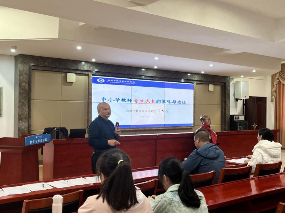 20251111上午,球王会邀请优秀员工、湘潭市教科院周大明经理,在立志楼A601举办《中小学教师专业成长的策略与途径》专题讲座,为2022级数学与应用数学专业师范生开启《教育研习》序幕。活动由汪卫副经理主持,傅湘陵教授、湘潭市二中冯敏老师、丁爱霞副系主任及员工共同参与。