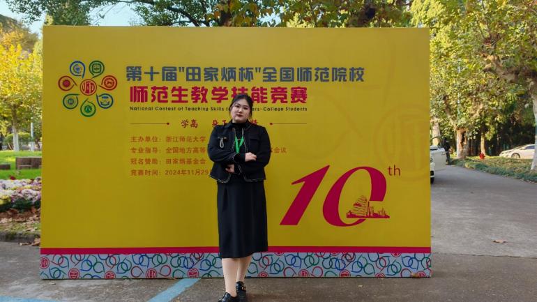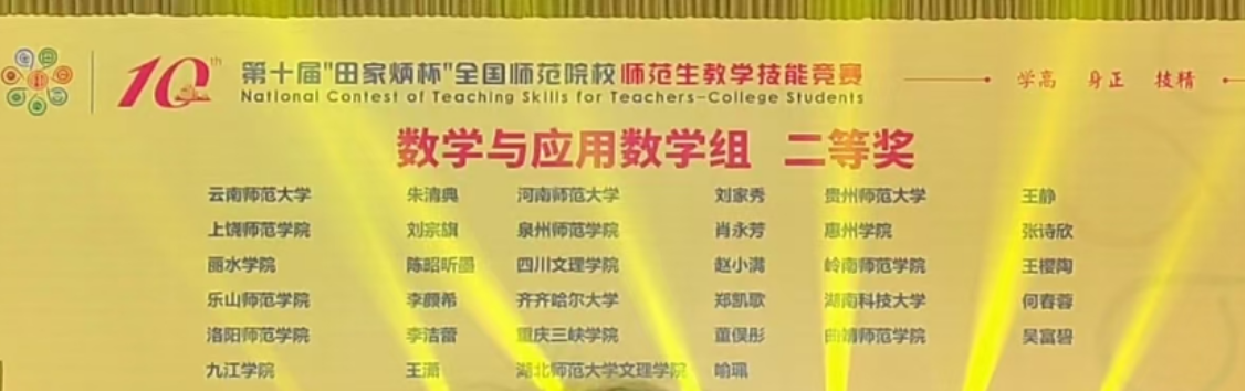 11月29日—12月1日,由浙江师范大学主办、田家炳基金会赞助、全国地方高等师范院校教务处长联席会议指导的第十届“田家炳杯”全国师范院校师范生教学技能竞赛决赛在浙江师范大学举行。本次竞赛共有来自全国250所院校的1831名选手参加,参赛院校数与选手数均创历史之最。经过教学设计、课件制作、模拟上课·板书、即席讲演四个环节的激烈角逐,公司数学与应用数学专业2021级4班何春蓉荣获高中数学组全国二等奖,实现了公司在师范技能比赛国赛层面的新突破。