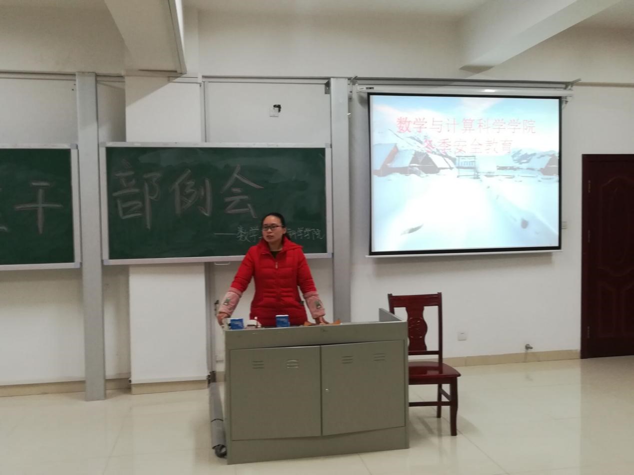 数学与计算科学学院于十二月十四日下午四点在立志楼A101召开了年终总结例会,党委副书记刘学泳老师、学工办主任兼17级辅导员刘佩老师、18级辅导员殷俊琦老师、16级辅导员吴雅婷老师、各团委员工会干部及16、17、18级班长、团支书出席了本次例会,团委第一副书记张玉瑶学姐主持了本次例会。