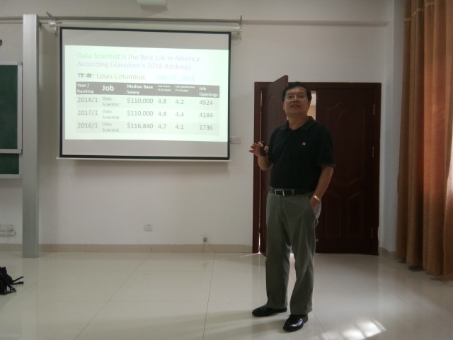 6月28日下午4:30,在立志楼A101,由数学与计算科学学院主办的,南方科技大学田国梁教授应邀,进行了“金融保险统计,生物统计和大数据在国内升研与就业前景”的学术报告,全体17级应用统计系的同学们参与并听讲了本次学术报告。