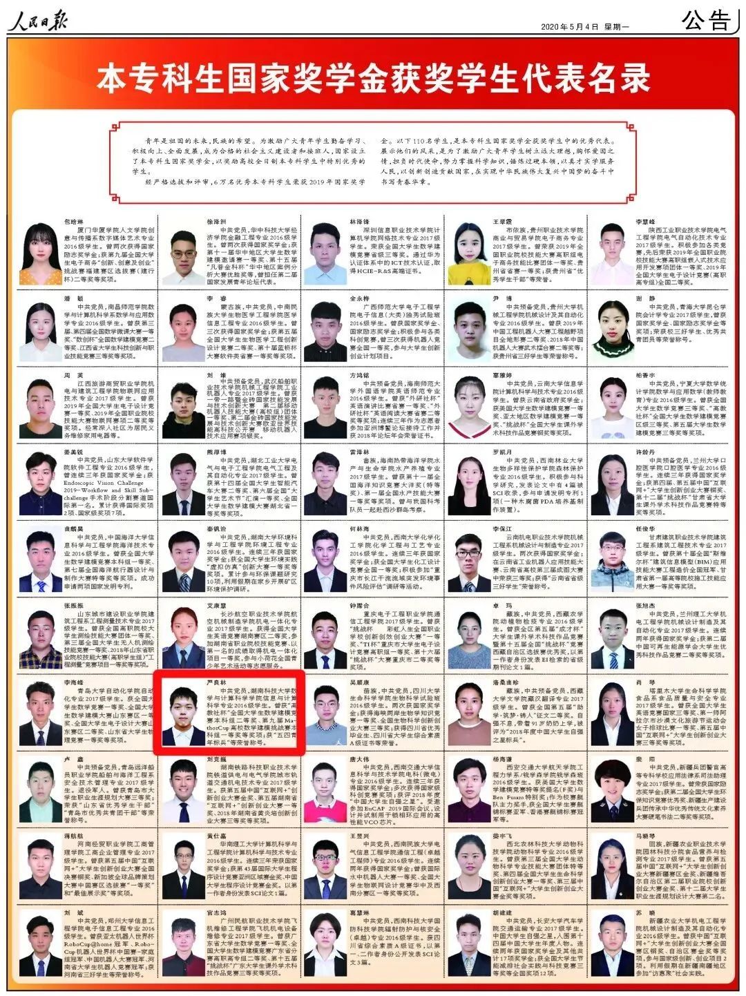 青年是祖国的未来,民族的希望。为激励广大青年员工勤奋学习、积极向上、全面发展,成为合格的社会主义建设者和接班人,国家设立了本专科生国家奖学金,以奖励高校全日制本专科员工中特别优秀的员工。经严格选拔和评审,6万名优秀本专科员工荣获2019年国家奖学金。2020年5月4日,公司数学与计算科学学院信息与计算科学专业2016级严良林同学入选了人民日报本专科生国家奖学金获奖员工代表名录。
