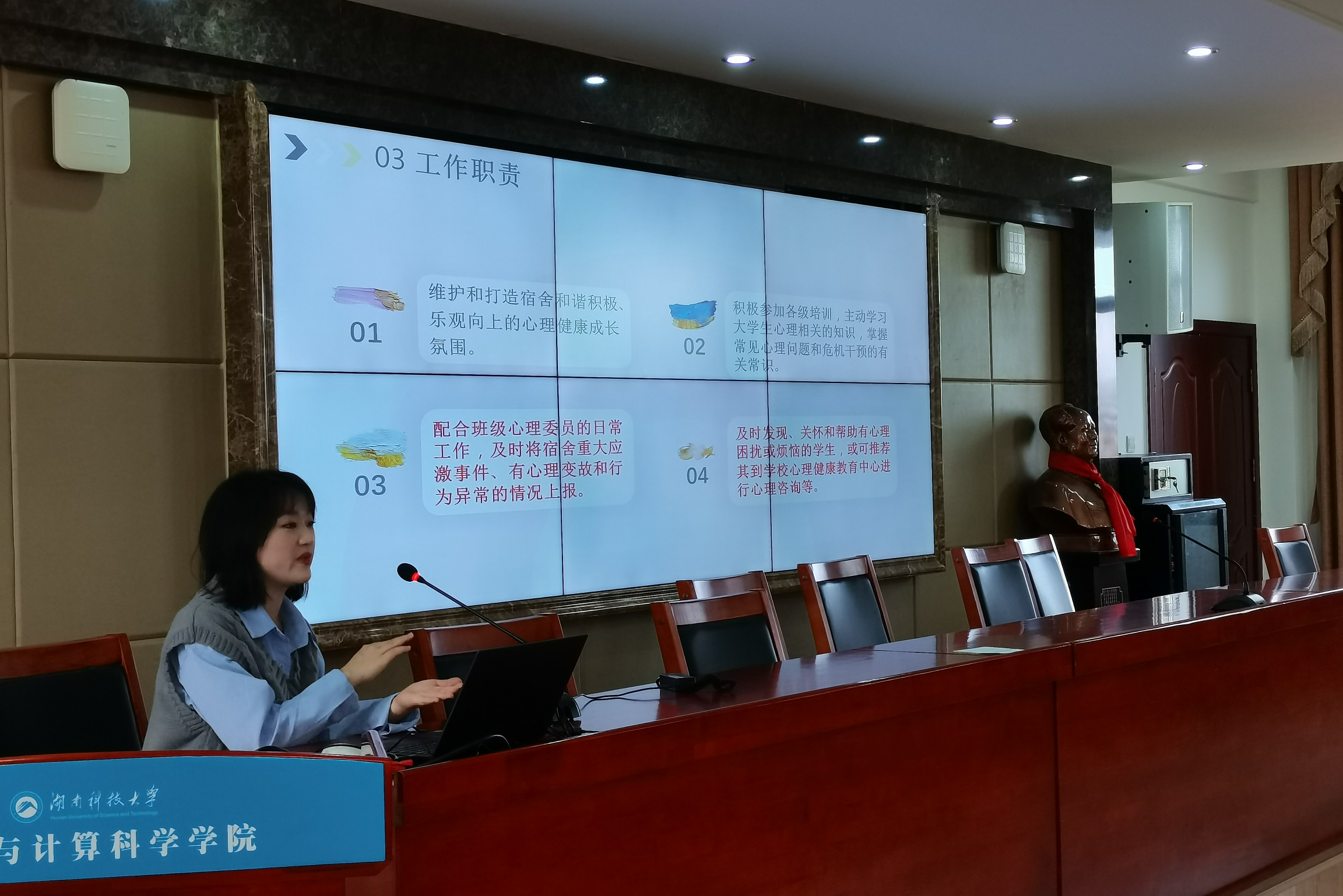 为提高各寝室长的思想认识水平,明确心理健康教育工作的重要性,了解相关心理知识,初步掌握老员工常见心理问题的表现和应对措施,提高寝室长的自我心理调节能力和助人能力,公司2023年5月24号上午在立志楼A601开展2022级寝室长培训活动,本次会议由学工办吴雅婷老师主持,球王会体育官网心理健康教育中心咨询师付小丽应邀为公司员工作讲座。