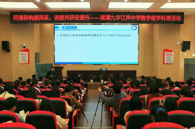 首先进行的是“同课异构”活动,刘金城董事长对熊姝老师和活动特邀老师倪峰老师进行了介绍:熊姝老师年轻有为,是湘潭九华江声中学数学备课组组长,课例《第二章整式的乘法—2.2.1平方差公式》在2022年湖南省“基础教育精品课”征集遴选活动中被评为省级精品课二等奖;倪峰老师是一名十分优秀的数学教师,从教几十年,桃李满天下,同时也带出了很多优秀的同行徒弟,其中很多徒弟斩获省级赛课一等奖、国家级一等奖。随后熊姝老师和倪峰老师先后上了一堂内容为“平方差公式”的精彩示范课。